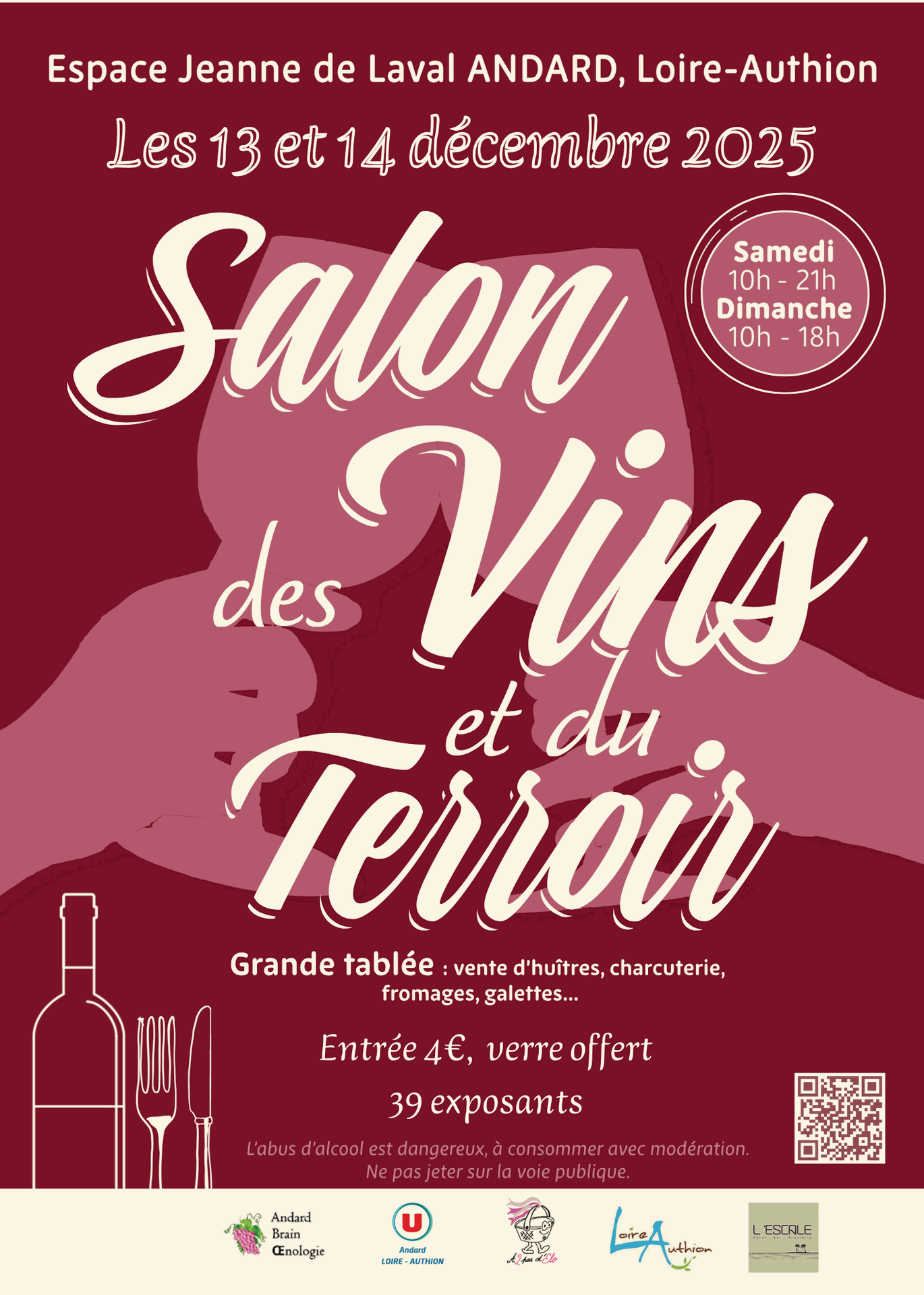 Un salon à découvrir entre amis ou en famille. Après les dégustations , venez partager un repas (huitres, charcuterie, fromages, galettes et crêpes ) en profitant le samedi en soirée d’une animation musicale.